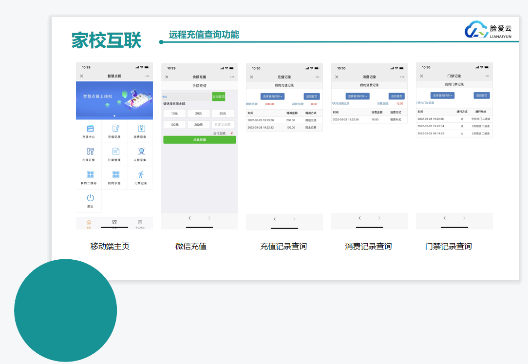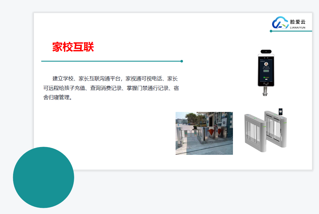 建立學(xué)校、家長(zhǎng)互聯(lián)溝通平臺(tái),家視通可視電話、家長(zhǎng)可遠(yuǎn)程給孩子充值、查詢消費(fèi)記錄、掌握門禁通行記錄、宿舍歸寢管理。