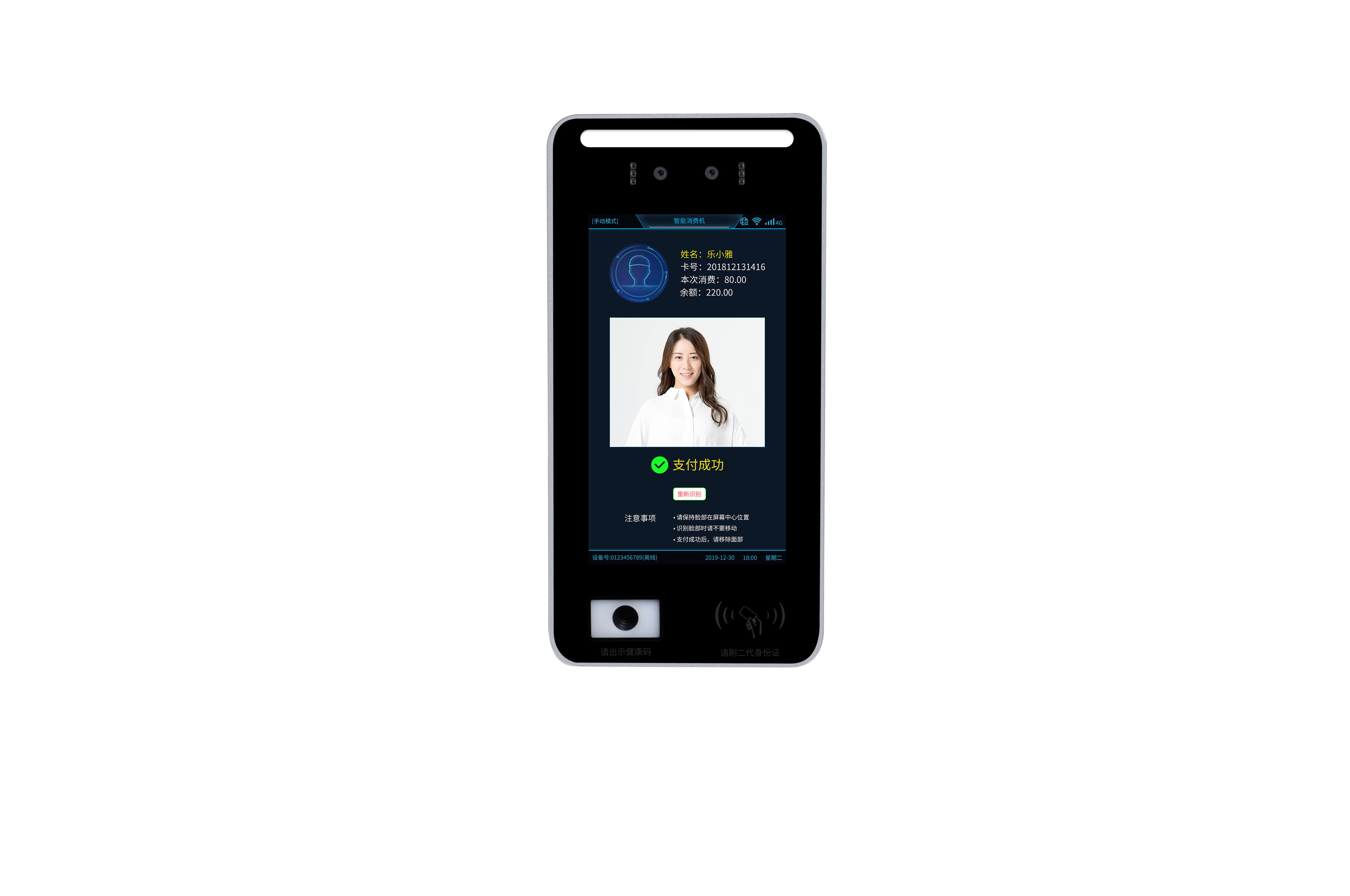刷臉消費機是基于生物特征識別技術的一種智能終端,通過攝像頭捕捉用戶面部圖像,并利用人工智能算法對其進行識別。用戶只需通過簡單的面部掃描,就可以完成支付、查詢個人信息等操作。這項技術的核心在于面部識別,它通過分析用戶的面部特征,構建人臉特征模型,并與數據庫中的用戶信息進行比對。